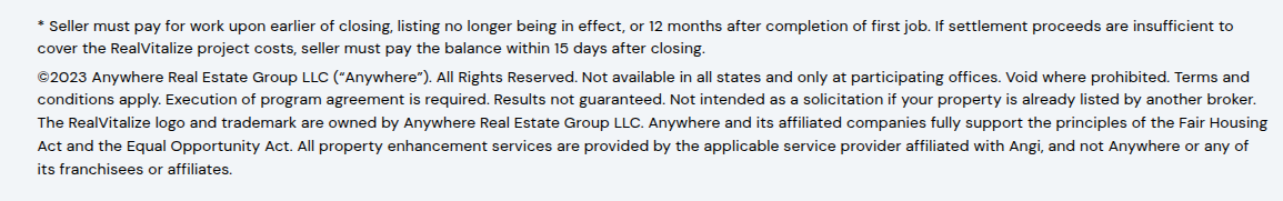 ©2023 Anywhere Real Estate Group LLC (“Anywhere”). All Rights Reserved. Not available in all states and only at participating offices. Void where prohibited. Terms and conditions apply. Execution of program agreement is required. Results not guaranteed. Not intended as a solicitation if your property is already listed by another broker. The RealVitalize logo and trademark are owned by Anywhere Real Estate Group LLC. Anywhere and its affiliated companies fully support the principles of the Fair Housing Act and the Equal Opportunity Act. All property enhancement services are provided by the applicable service provider affiliated with Angi, and not Anywhere or any of its franchisees or affiliates.